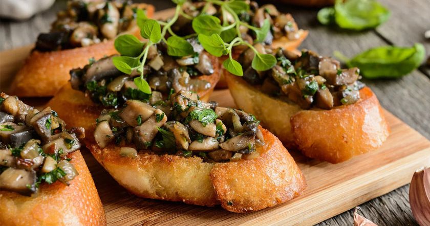 Брускетта – очень вкусное и простое блюдо, которое может быть перекусом или сытным завтраком, все зависит от фантазии и ингредиентов. В Италии это толстые ломтики домашнего хлеба, обжаренные на гриле до хруста, с разнообразной начинкой. Лучшие грибы для брускетты – белые, но в сочетании с ароматными травами и простые шампиньоны могут стать удивительно вкусными. Если у вас нет гриля, хлеб можно подсушить в духовке или на сковороде.