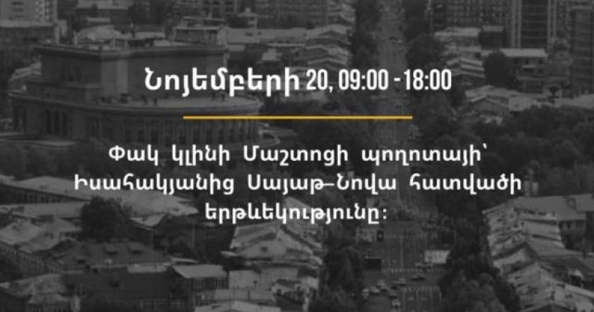 В связи с работами по новогоднему украшению Еревана 20 ноября с 09:00 до 18:00 будет перекрыто движение транспорта по участку проспекта Маштоца — от улицы Исакяна до улицы Саят-Нова. Об этом сообщает мэрия столицы. Cсылка оригинала: https://ru.yerevan.today/97080 Мысли и позиции, опубликованные на сайте, являются собственностью авторов, и могут не совпадать с точкой зрения редакции BlogNews.am. print Распечатать