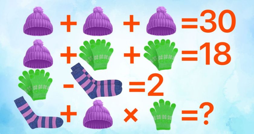 Находим значение шапки, 30 / 3 = 10. Идем далее и находим рукавички. (18 — 10) / 2 = 4. А одна рукавичка будет равняться 2. В третьем примере находим значение носков. Для этого 4 — 2 = 2, а один носок равен 1. Последний пример выглядит таким образом: 1 + 10 * 2 = 21.