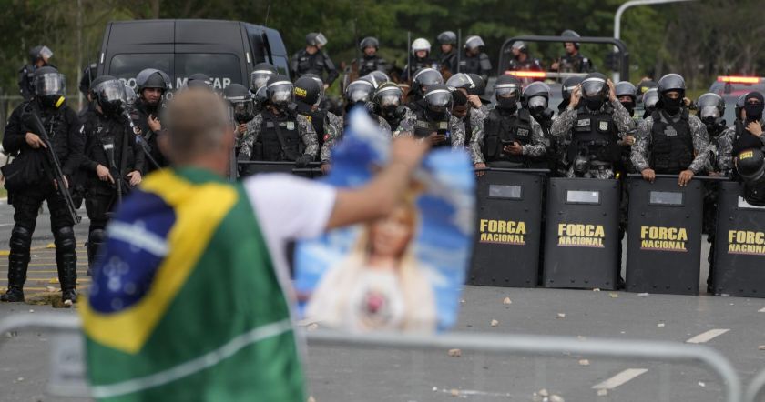 Речь идет о вандалах, ворвавшихся в здание Национального конгресса (парламента) страны и устроивших там погром. На кадрах из здания парламента видны многочисленные разрушения, битые стекла, поломанная мебель и даже костры. Кроме того, в эфире телеканала показали участников манифестаций, которых в наручниках вывели из здания президентского дворца. В здании Федерального верховного суда вандалы разгромили зал заседаний и похитили судейские мантии. Задержанных доставляют автобусами в полицейские участки.