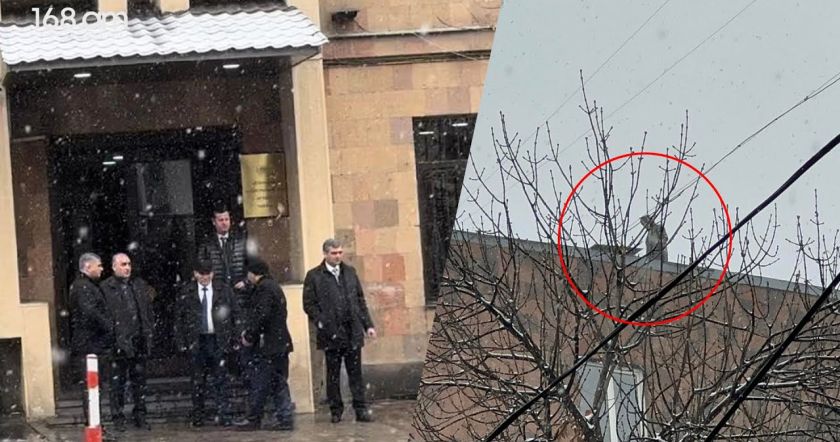 Видеокамера сайта 168.am зафиксировала группу полицейских, собравшихся перед зданием в преддверии визита Пашиняна, и находящегося на крыше снайпера.