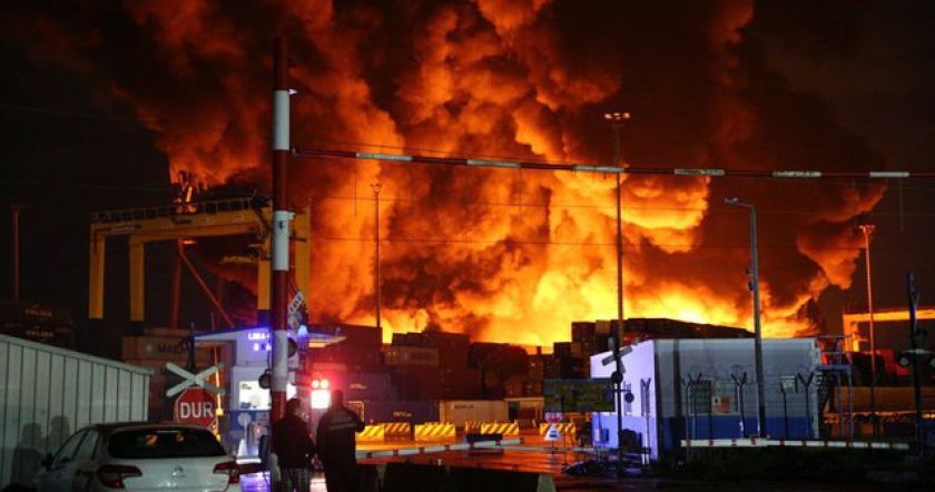 Из центра склада в небо поднимаются клубы черного дыма, виден огонь, периодически происходят взрывы. Площадь возгорания на данный момент может составлять несколько сотен квадратных метров.