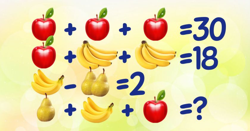 Кто-то очень быстро справляется с заданием и дает неправильный ответ. Чаще всего отвечают 14 или 16. Но правильный ответ на эту головоломку — 13,5. Дело в том, что пользователи просто не замечают, что иконки изображений с фруктами не везде одинаковы. На некоторых 4 банана, на других — 3. Похожая ситуация и с грушами.