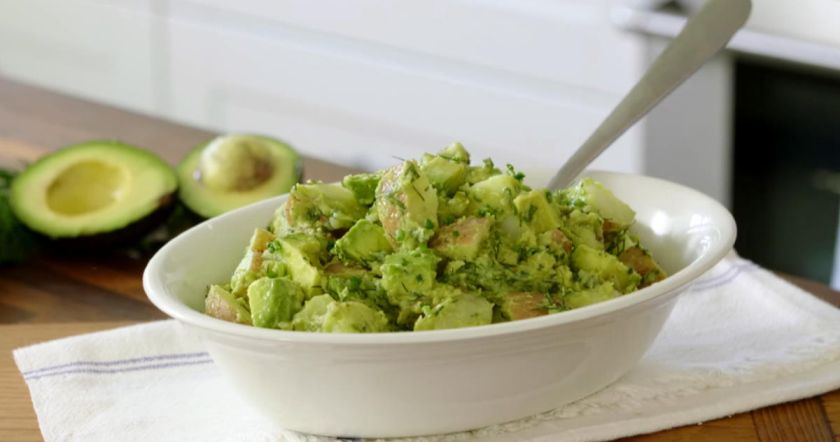 - Перемешивайте салат ложкой, пока авокадо не превратится в пюре. Сытный салат с авокадо и картофелем готов.