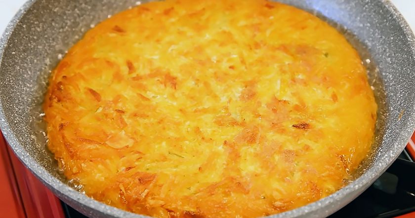 - Накрыть получившийся драник крышкой и готовить на минимальном огне 4-5 минут до золотистой корочки. Перевернуть. Готовить, накрыв крышкой, еще 4-5 минут. Затем посолить, поперчить и обжаривать драник без крышки еще по 2-3 минуты с каждой стороны до образования хрустящей корочки.