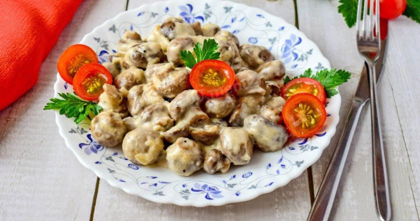 - Грибы в сливках с сыром готовы. Блюдо рекомендуется подавать горячим. При желании на стол его можно ставить в качестве основного, с салатами, как гарнир к мясу или как горячую закуску.