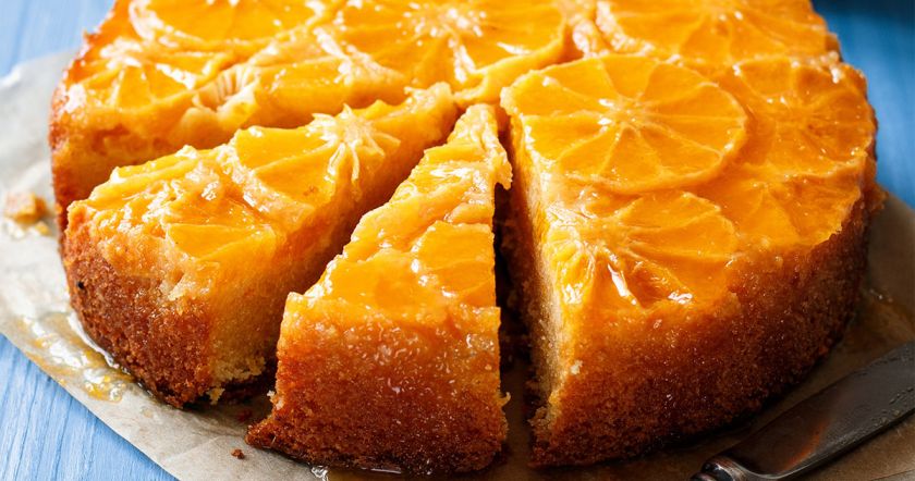 - Готовый мандариновый пирог переверните на блюдо, чтобы мандарины оказались сверху, и подайте к столу.