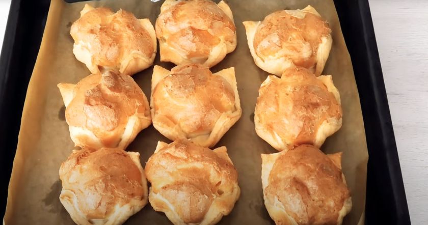 - Переложите первую партию слоеных заготовок на противень, застеленный пергаментом. На середину каждого выложите по столовой ложке заварного теста. Соедините края слоеного теста в конверт, но не скрепляя между собой, а слегка прижимая к заварному тесту.