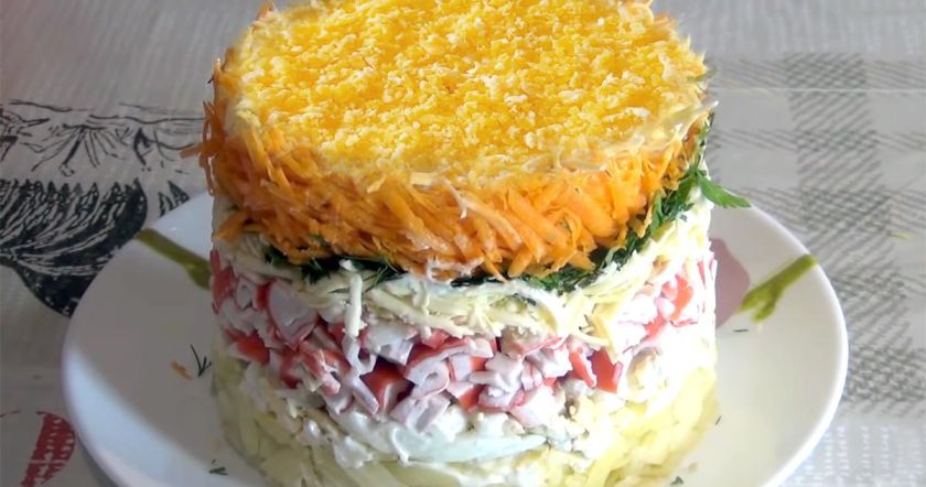 Слоеный салат с крабовыми палочками, сыром и морковью по-корейски выглядит как настоящий торт. Такое блюдо станет украшением любого стола, кроме того, готовится оно быстро и просто.