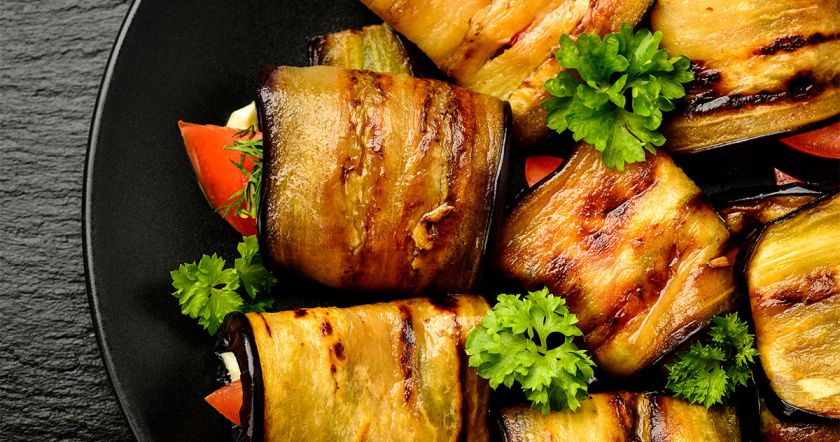 - Скрутите баклажаны в рулетики, выложите на блюдо и украсьте зеленью.