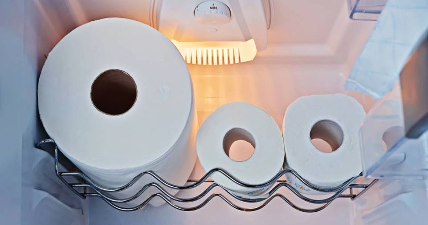 Один рулон туалетной бумаги способен впитать до 450-500 мл влаги, что довольно приличный объем в сравнении с количеством конденсата в холодильнике. Так что одного рулона в качестве поглотителя влаги и запаха хватит минимум на несколько месяцев. Главное — найти под него неприметное место :)