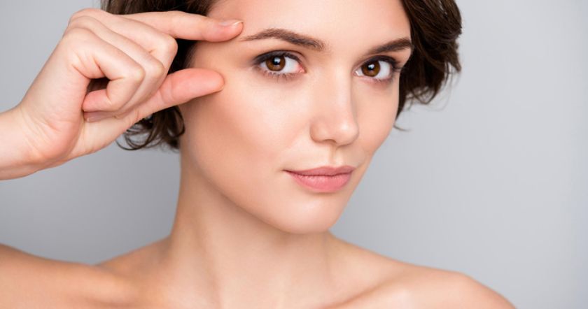 Нанесите крем на нижнее веко и зону под глазами. Задержите указательный палец у внутреннего уголка глаза на слезной косточке.