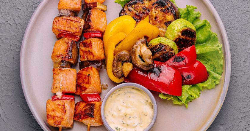В случае с ограниченным рационом питания на строгой диете не стоит отказываться от такого вкусного блюда, как рыбные шашлыки с салатом из чечевицы и йогуртом (всего 507 калорий на порцию!). Изначально рецепт рассчитан на четырех человек, но вы можете увеличить количество порций по своему желанию. Еще один факт в копилку достоинств этого блюда — готовятся необычные, но не менее вкусные шашлыки всего 22 минуты.