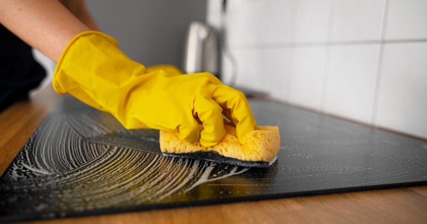 Затем приготовьте для работы чистую, мягкую ткань или губку. Большинство индукционных плит имеют стеклянную поверхность, поэтому для ее очистки не стоит использовать грубые материалы.