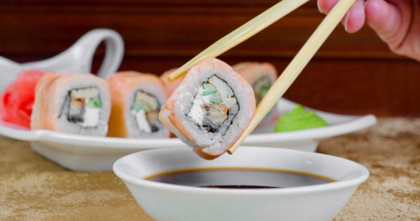 - При употреблении суши или роллов, погружайте только рыбу или морепродукты в соевый соус, а не рисовую сторону.