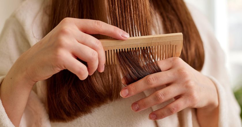 6. Расческой с редкими зубьями расчешите волосы, чтобы состав распределился равномерно.