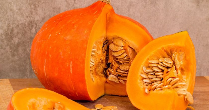 Если тыква выскальзывает из рук, эксперт советует положить её на доску и разрезать пополам. Затем, в зависимости от размера, можно разрезать её ещё на более мелкие части. Получившийся кусок можно легко очистить от кожуры ножом.