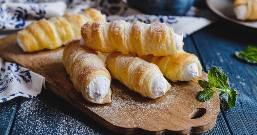 Раскатайте тесто в прямоугольную форму и сделайте 16 горизонтальных надрезов. Возьмите конусообразные формы для трубочек (или сделайте их сами из фольги) и намотайте каждый лоскут теста вокруг формы. Смажьте трубочки желтком и выпекайте 25 минут при 240 градусах.