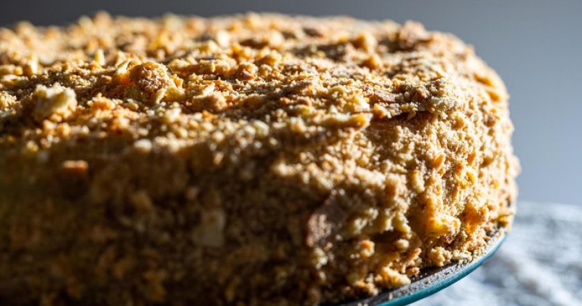 Чтобы украсить десерт, используйте 100 г грильяжа. Обсыпьте им кремовые бока торта, но верхушку оставьте открытой.