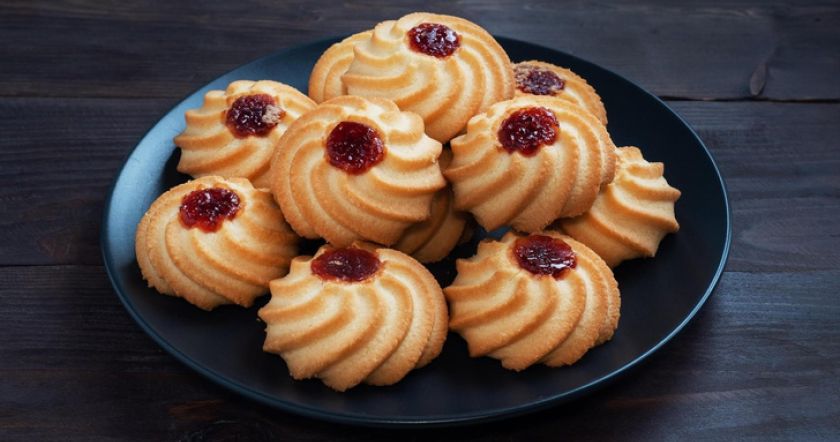 Выстелите на противень пергаментную бумагу. Выдавите на нее из кондитерского мешка тесто, образуя легкие зигзаги, и ложкой выложите в центр каждого печенья немного повидла. Выпекайте десерт в духовке в течение 20 минут при температуре 200 градусов.