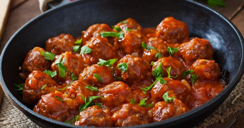 При желании можно дополнительно запечь в духовке, предварительно посыпав фрикадельки тертым пармезаном. Подавать с зеленью.