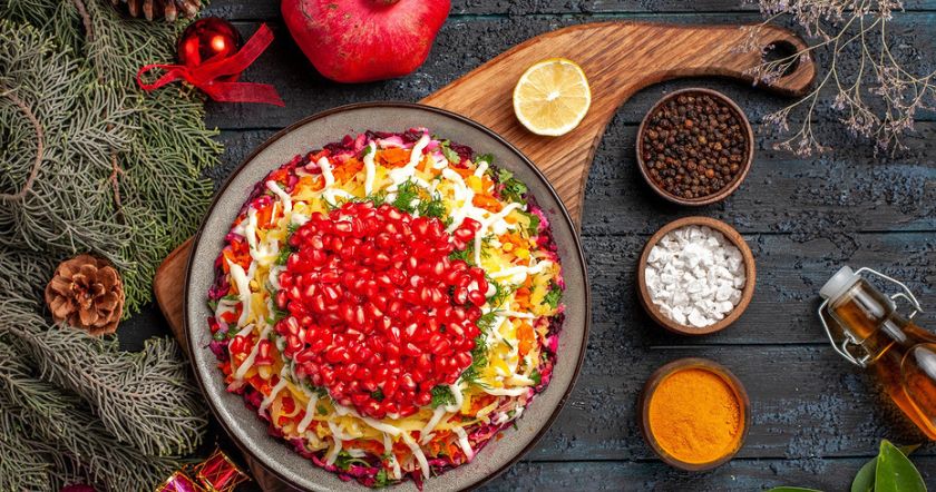 Подборку салатов на новогодний стол начнем с нарядного и вкусного варианта со свежим гранатом. Он станет прекрасным угощением для гостей.