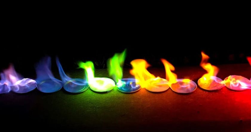 Пламя может иметь и непривычный нам цвет, потому что его могут окрашивать различные примеси. Порой, смотря на костёр, можно заметить отдельные яркие жёлтые траектории частичек. В процессе горения дерева появляется зола, в которой содержатся соли, в том числе и соли натрия. Именно натрий обладает свечением в жёлтой области спектра. Но различить натрий получается не всегда на фоне непрерывного теплового свечения сажи. Борная кислота придаст пламени зелёный цвет, а фиолетовым «горит» калий. Окрасить пламя в синий может мышьяк.