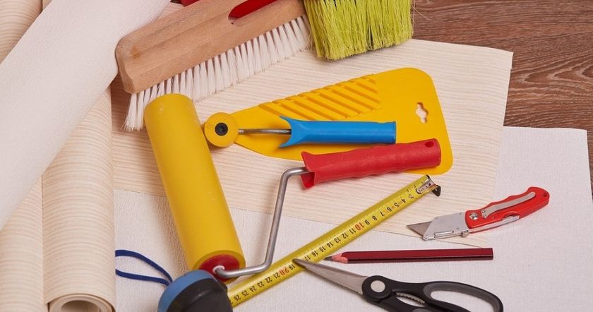 Подготовьте тюбик с клеем и тряпку или салфетку для вытирания его излишков, из инструментов понадобятся резиновый валик для раскатывания обойного полотна и кисть (проверьте, чтобы у нее прочно держался ворс, иначе щетинки останутся под покрытием). Также может пригодиться нож, наждачная бумага и резиновый скребок.