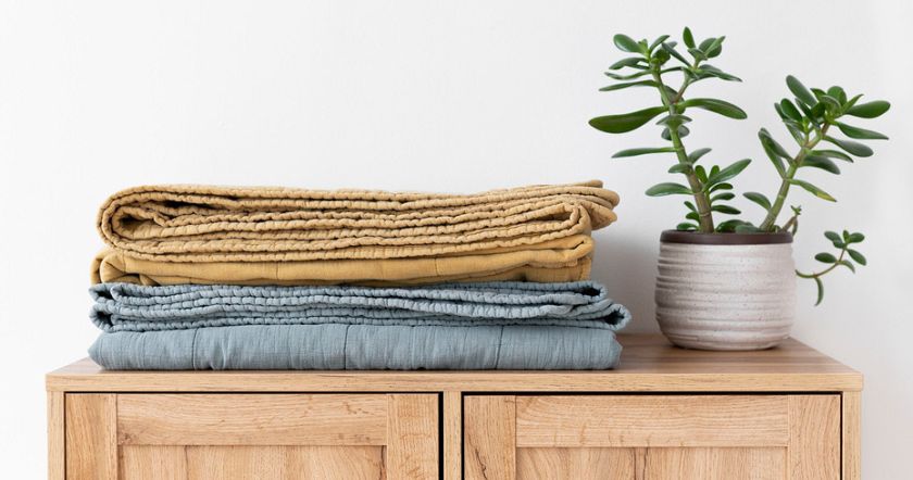 Бельевой шкаф облегчит хранение изделий. На уровне глаз положи комплекты, которыми пользуешься сейчас. На верхней полке можно хранить несезонные вещи. Например, убрать теплое одеяло и плед на лето. Зимой наверху можно хранить тонкие одеяла. Так будет удобнее доставать нужные наборы.