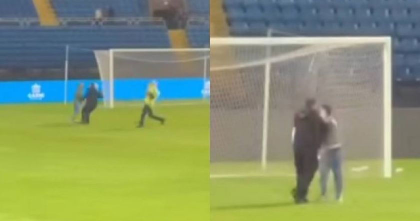 На видео, выложенном в соцсети видно, как сотрудник бьет кулаком по лицу юного болельщика, выбежавшего на поле после матча.
