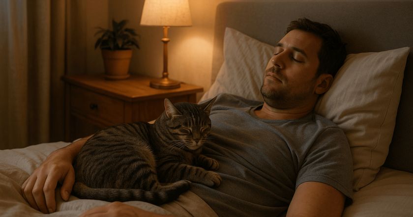 А ещё много значат ваша поза и ваш сон. Если вы спите крепко, не крутитесь и не храпите — это огромный плюс для кошки. Она, как и вы, хочет выспаться. Поза тоже очень важна: животные часто ложатся на грудь, в изгиб руки или между ног — там тепло и удобно. Так что, если вы спите, скажем, на спине, вы — идеальный матрас для пушистой спящей королевы.