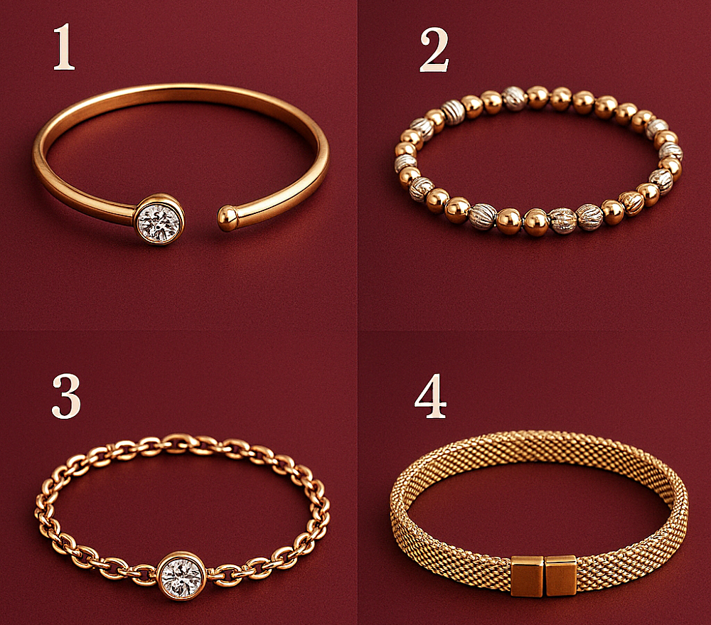 Я предлагаю вам маленький тест. На картинке четыре браслета. Выберите тот, на который взгляд упал первым. Не прикидывайте, что «подойдёт под платье» или «под мой стиль». Тут важен первый порыв, а не логика. А потом прочитайте, что этот выбор может рассказать о вас.