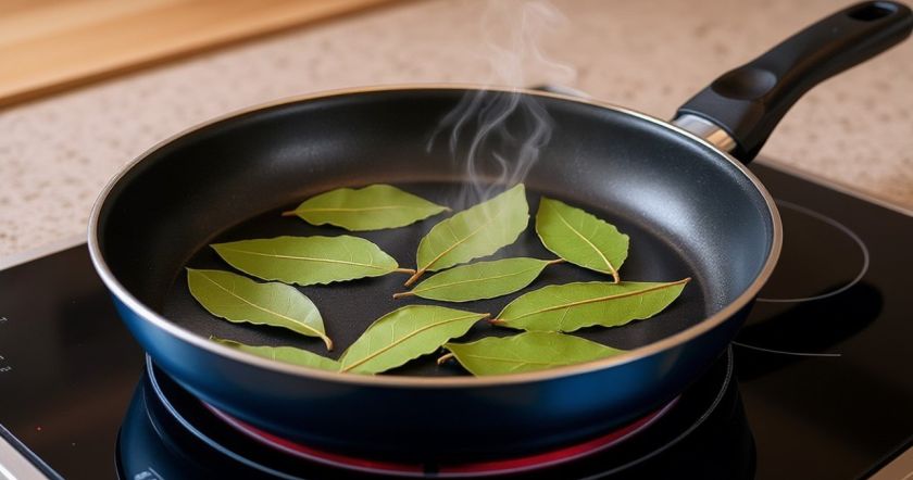 Во-вторых, оптимальным решением является использование термической обработки без открытого огня. Возьмите сухую сковороду среднего размера и поместите в нее 4-6 лавровых листьев среднего размера. Количество листьев может варьироваться в зависимости от площади помещения и желаемой интенсивности аромата.