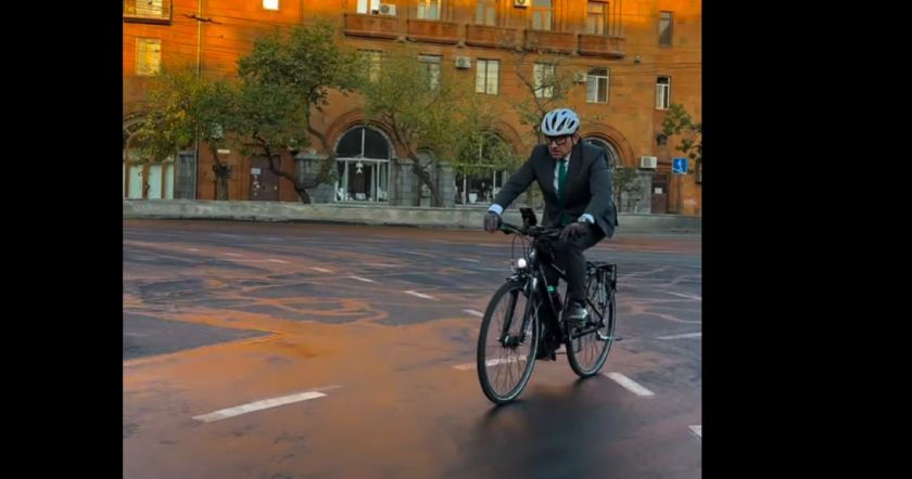 Никол Пашинян сегодня решил добраться на работу на велосипеде. Как заметили люди под его видео, в костюме не удобно ездить на велосипеде, и очень странно что проезжая часть утром в будний день пуста, а где же машины?