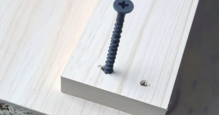 Этап 1. Начальное закручивание — установите саморез в нужную точку на доске и слегка вкрутите его шуруповёртом на небольшую глубину.