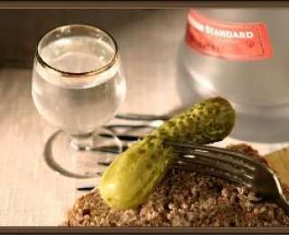 3. Сразу после «залпа» закусите. Очень важно нейтрализовать алкоголь. Это лучше всего сделать , если еда соленая или кислая. Это могут быть соленые помидоры, огурцы, квашенная капуста, икра на хлебе с маслом , селедка — можно с вареной холодной картошкой и луком или с вареной свеклой и майонезом, шпроты или сардины . Если этого нет — можно закусить традиционным русским салатом, они называют его «Оливье» ( это смешивается вся еда, что есть в доме, добавляются вареные яйца и все заливается толстым слоем майонеза). Украинцы любят закусывать копченым салом с чесноком , но эта закуска — для профессионалов.