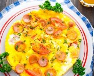 Простой и вкусный завтрак: омлет с помидорами черри, сосисками и зеленью.