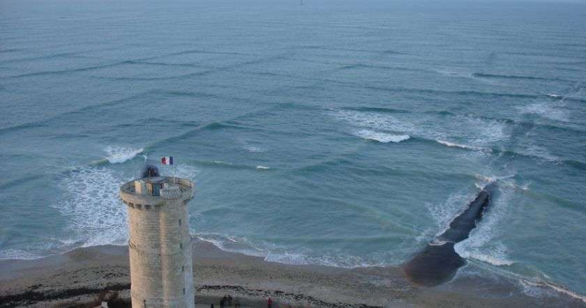 Например, один набор волн следует за нормальным притяжением к берегу, но сильный ветер создает дополнительный набор волн, идущих против них. Это формирует совершенно квадратную картину.