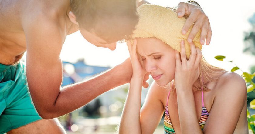 Это перегрев организма, вызывающий нарушение работы всех систем жизнедеятельности. Вначале пострадавший чувствует сильную жажду, головную боль, сонливость, слабость, головокружение, начинается обильное потоотделение. Если перегрев продолжается, то лицо краснеет, температура тела повышается вплоть до 40 градусов, начинается рвота и диарея. Критический перегрев вызывает галлюцинации и бред, потерю сознания. Лицо больного становится белым, а кожные покровы – холодными, однако пульс учащается. Скорую помощь рекомендуется вызвать как можно раньше. Особенно, если пострадал ребенок.