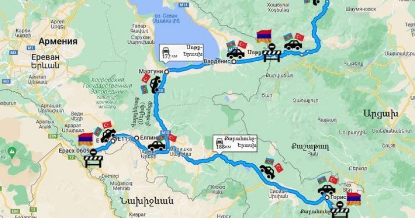 На карте ниже вы можете увидеть дороги, по которым, согласно договоренности Пашиняна и Алиева, будут ездить азербайджанцы. В одном случае, условно, они стартуют из Гандзака (Кировабада) и, достигнув Вардениса, въедут в Мартуни, затем проедут через село Геховит через перевал Варденяц (Селима), проедут возле Ехегнадзора через села Арпи, Арени, Чива, Елпин, Зангакатун, Тигранашен, Пар Севак, Ерасхуйр и доедут дойдут до границы с Нахичеваном. Это направление дороги составляет около 172 км.