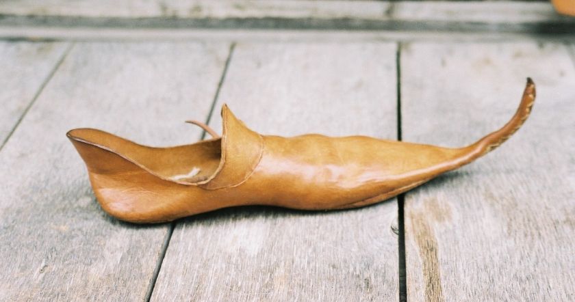 Постепенно фасон этой обуви становился все уже, а носок только удлинялся - это считалось пиком моды. Основная часть причудливых ботинок делалась из кожи или бархата, в подошве использовалась твердая бычья или свиная кожа. Мысы такой обуви могли достигать рекордных 20 дюймов, то есть 50 см. Иногда уплотненные кончики передней части туфель заворачивались и подвязывались серебряными нитками, китовым усом или тесьмой к коленям владельца при ходьбе.
